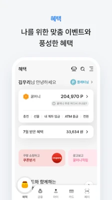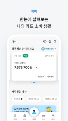 우리WON카드 kokoaa kaikki olennaiset taloustiedot yhteen paikkaan. 'MY'-osiosta näet yhdellä silmäyksellä muun muassa tulevat maksuerät, käytettävissä olevan luoton ja kaikki omistamasi kortit. Voit myös tarkastella pankki- ja korttitilejäsi kokonaisvaltaisesti. Korttihakemusten täyttäminen on nyt entistä sujuvampaa automaattisen tietojen esitäytön ja välitallennuksen avulla, ja tekoälyyn perustuvat suositukset auttavat sinua löytämään täydellisen kortin. 'Edut'-osiosta löydät henkilökohtaiset tarjoukset ja näet selkeästi kuluneen kuukauden aikana saamasi hyödyt, kuten alennukset ja kertyneet pisteet. 'Rahoitus'-osiosta voit hakea lyhyt- tai pitkäaikaista korttilainaa tai valita luoton maksuaikaohjelman, usein pelkällä henkilöllisyyden todentamisella. Luottolainaa voivat hakea myös 우리카드-asiakkuutta vailla olevat käyttäjät KakaoPay-tunnistautumisen kautta.