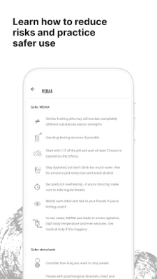 *KnowDrugs* omaksuu haittojen vähentämisen periaatteen tunnustaen, että päihteiden käyttöön liittyy luontaisesti riskejä, kuten vammoja, riippuvuutta ja jopa kuolemaa. Sovellus esittelee kattavia strategioita näiden haittojen minimoimiseksi. Sen avulla opit tunnistamaan hätätilanteet ja toimimaan oikein, esimerkiksi kuinka tukea henkilöä, joka kokee "pahan tripin" juhlissa tai festivaaleilla. Lisäksi *KnowDrugs* auttaa sinua löytämään maksuttomia ja luottamuksellisia neuvontapalveluita, jotka kunnioittavat henkilökohtaisia valintojasi ja auttavat sinua kehittämään strategioita ja osaamista, jos harkitset muutoksia kulutuskäyttäytymiseesi. *KnowDrugs* on kumppanisi kohti turvallisempaa ja tietoisempaa päihteiden käyttöä.