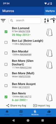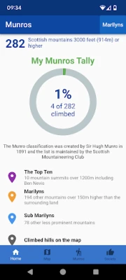 Oletko valmis Skotlannin Munro- ja Marilyn-huippujen valloitukseen? Seuraa edistymistäsi henkilökohtaisella lokilla ja interaktiivisella kartalla. Kohdista tavoitteesi 282 Munroon (yli 914 m) tai 202 Marilyn-huippuun (yli 150 m ympäristöään korkeampia). Pidä kirjaa saavutuksistasi ja suunnittele seuraavat seikkailusi.