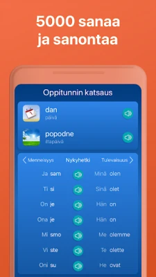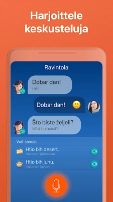 **Mondly** varustaa sinut puhumaan itsevarmasti ja tarkasti. Sen ammattimaisten ääninäyttelijöiden tarjoama kristallinkirkas ääni opettaa sinulle natiivipuhujien oikean ääntämisen. Huippuluokan puheentunnistus antaa sinulle palautetta vain, kun lausut sanat ja ilmaisut oikein, hioessasi aksenttiasi täydelliseksi. Sovellus ei painota sanaluetteloiden ulkoa opettelua, vaan tarjoaa hyödyllisiä ilmauksia todellisiin tilanteisiin, lyhyinä, teemakohtaisina oppitunteina. Voit helposti seurata edistymistäsi älykkään tilastoinnin avulla ja nähdä sanavarastosi kasvavan päivä päivältä. Lisäksi **Mondly** mukautuu oppimistyyliisi ja kehittyy henkilökohtaiseksi oppaaksesi ja opettajaksesi. Opi kroatian taivutukset nopeasti koskettamalla verbejä ja näet käännökset välittömästi. Ennen kuin huomaatkaan, hallitset tuhansia sanoja ja ilmauksia, ja olet matkalla kohti uuden kielen taitamista.