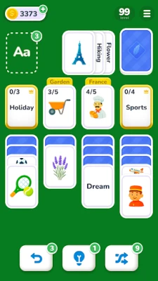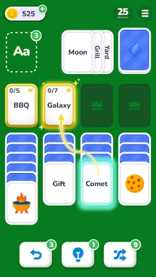 Pelattavuus Word Solitaire: Categories -pelissä alkaa luokkakortin asettamisesta – tunnistettavissa kruunukuvakkeesta, joka voi edustaa esimerkiksi koruja, tunteita tai juhlia. Tämän jälkeen tehtävänäsi on yhdistää ja pinota asiaankuuluvat sana- tai kuvakortit oikeisiin luokkiinsa, rakentaen yhtenäisiä pinoja huolellisen lajittelun ja logiikan avulla. Tavoitteenasi on täyttää koko pelilauta ennen siirtojen loppumista. Jos joskus juutut, käytössäsi on kolme hyödyllistä työkalua: Vihje ehdottaa seuraavaa pätevää siirtoa, Peruuta-toiminto antaa sinun harkita edellisen siirron uudelleen, ja Jokerikortti, kun se on asetettu, mahdollistaa minkä tahansa kortin pinoamisen sen päälle, avaten uusia strategisia polkuja. Nämä elementit erottavat Word Solitaire: Categories -pelin edukseen muiden korttipelien ja assosiaatiopulmien joukosta.